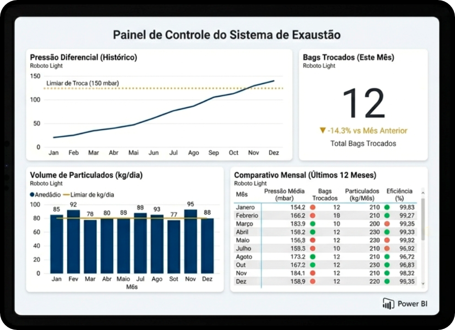 Com o Power BI, você tem visibilidade total da manutenção: relatórios gerenciais, indicadores, histórico, alertas em tempo real e dashboards claros. Acompanhe remotamente climatizadores, exaustão e filtros, identifique tendências e comprove a eficiência do contrato com transparência.